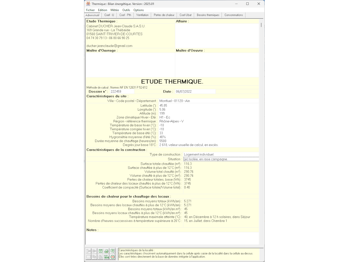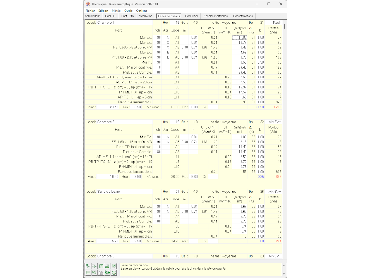 - Calculs détaillés des déperditions par parois opaques, vitrages, ponts thermiques